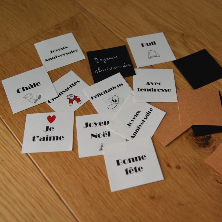 Pour personnaliser le contenu, vous pouvez choisir des étiquettes évènements (anniversaire, noël...), ou bien laisser un message (bisous, amour...) ou tout simplement indiquer ce que la pochette contient : ex. pour les tricoteuses (chaussettes, pulls...). , mais également inscrire votre propre message, rendant chaque création unique et adaptée à vos besoins.